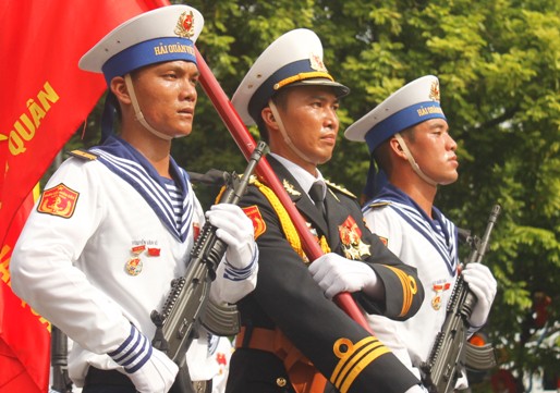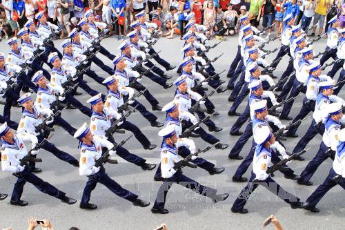 ![]() Khối Hải quân diễu binh, diễu hành trên phố Nguyễn Thái Học. Ảnh: TTXVN |