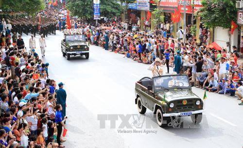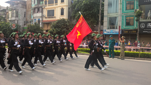 ![]() Khối lực lượng dân quân diễu binh, diễu hành trên phố Nguyễn Thái Học. Ảnh: TTXVN |