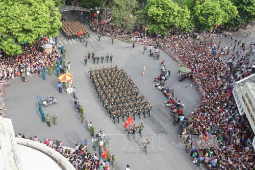 ![]() Đoàn diễu binh, diễu hành trên phố Hàng Khay, Tràng Tiền. Ảnh: TTXVN |