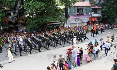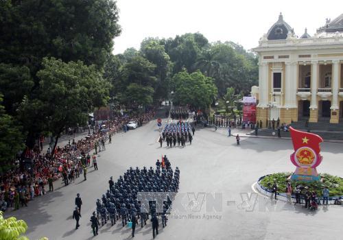 ![]() Khối lực lượng công an, an ninh diễu binh, diễu hành trên phố Nguyễn Thái Học. Ảnh: TTXVN |