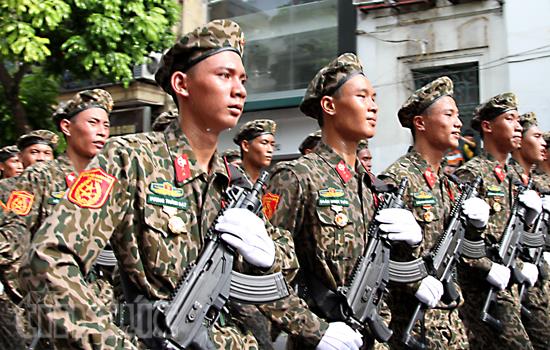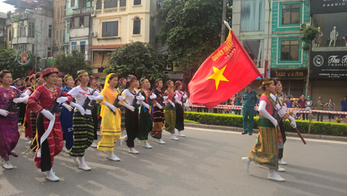 ![]() Lực lượng dân quân tự vệ dân tộc thiểu số diễu binh qua phố Tràng Tiền. Ảnh: Việt Hoàng. |